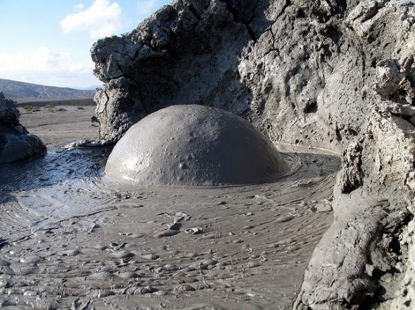 Mud volcanoes are formed when cold mud, gas and water from kilometers below the earth’s crust are forced upward and expelled into cone shaped mounds on the surface. Of the 700 mud volcanoes identified on land, 400 are located along the Caspian coastline in Azerbaijan, where the typical mud volcano is about four meters in height, though the largest can reach up to 700 meters. And although the tepid globular emission is significantly less molten then their larger erupting volcanic cousins, mud volcanoes can still offer a theatrical performance.