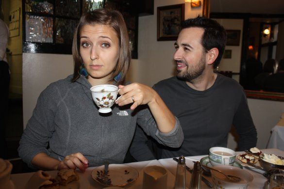 Rand marvels as my perfect manners (notice my extended pinkie finger) while we have tea with his colleagues during a business trip to the U.K.