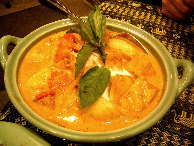 Massaman curry is frequently referred to as “red curry” because of the red sauce that accompanies it. Though the traditional version includes beef, many people substitute that for duck, chicken, pork, or for a vegetarian version, tofu. The curry paste remains the same for all versions of the dish. Here, you can detect flavors such as coconut milk, roasted peanuts and/or cashews, and potatoes. In terms of spices, see whether your taste buds can tell the cinnamon, star anise, palm sugar, chili sauce and tamarind sauce.
