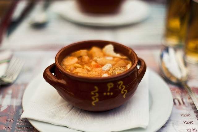 Gazpacho is a cold raw vegetable soup including tomato (the main ingredient), onions, cucumber, bell peppers, garlic, olive oil, vinegar, stale bread, herbs and water. Its roots date back to ancient times, possibly to the time when the Moors arrived in Spain or to the time of the Romans and their addition of vinegar. It became part of the Spanish cuisine of Andalucia, especially Córdoba and Sevilla. Nowadays, you can get great gazpacho in almost all Spanish cities and towns.