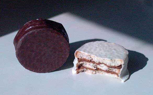 Alfajores in their many varieties can be found in South and Central America, and also still in Spain. Etymology suggests that they’re from the Arab world, though most now consider these to be squarely (roundly?) Latin American. They’re shortbread or cakey cookies pressed together over a filling of dulce de leche, or milk caramel. Sometimes they’re rolled in shredded coconut or covered in dark or white chocolate, or coated in meringue. Pictured here are triple-deckers, for your munching pleasure. These are found at bakeries and mass-produced in convenience stores and newsstands.