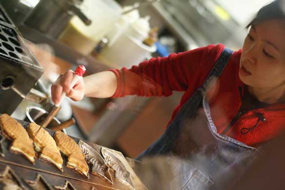 A little waffle-like fish-shaped pastry filled with a sweet red bean paste can take the chill out on a cold day, or keep the munchies at bay until you find the perfect place for lunch while walking the populated streets of any street festival or market. Watching taiyaki be freshly made in cast-iron griddles can take up the better part of your nibble time, which means you’ll be able to plunk down some more yen to buy a second one. If you can’t find the “baked sea bream” (as taiyaki means in Japanese) console yourself with imagawayaki, a round cake made in different molds, but which tastes the same.