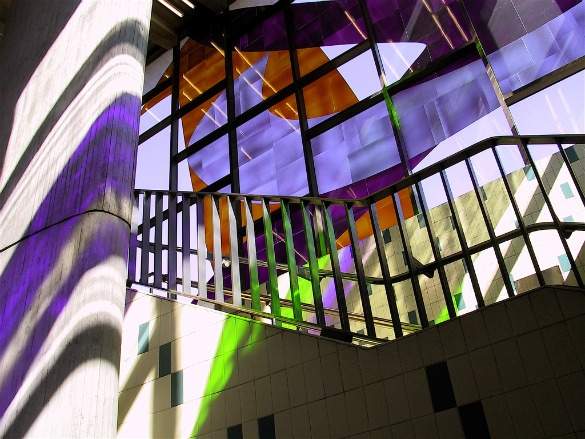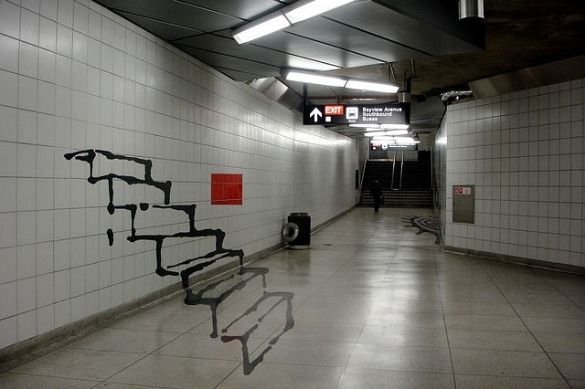 Throughout the station, you can see From Here Right Now, a trompe l’oeil installation by Toronto artist Panya Clark Espinal. Her website explains that in From Here Right Now, “twenty-four hand-drawn images have been ‘projected’ onto the architecture of the station so that when seen from the original location of projection, the images are crystalized and realistic, but when seen from other locations they appear to be abstractions. These images act as beacons, drawing the viewers along various paths of movement. Depicting everyday objects and simple geometric shapes, the images are rendered in an uncommonly large scale and in unusual orientations, allowing one to interact playfully with them as one moves through the space.”