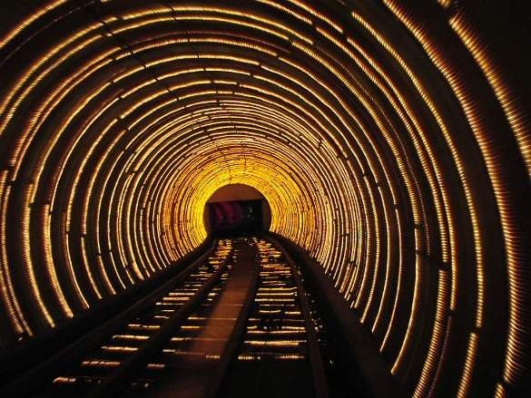 Small cable cars take visitors from one end of the tunnel to the other. Throughout the ride, the tourists are entertained visually with lighting in all colors you can imagine. A puppet might also occasionally wave at you, or a movie screen might appear and disappear again. All along, there’s house music blasting so your ears enjoy the journey, too.