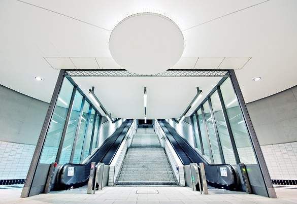 At each end, the station is anchored by a 35m tall glass atrium, where vertical circulation between the terminal levels is concentrated. So that the maximum amount of daylight can enter the station’s lower levels, the glass curtain walls are supported by a minimal cable truss structure, which evokes a sense of lightness and transparency.