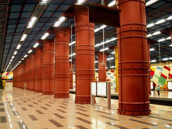 The construction of this station was first begun in 1986, and expanded in 2001. The station is worth viewing not only for its underground architecture, but also for one of its subway entrances. Click here to see the unique entrance, which looks like a train bursting through the sidewalk from below. Architect Zbiginiew Peter Pininski reported he felt inspired by surrealist artist René Magritte when creating it.