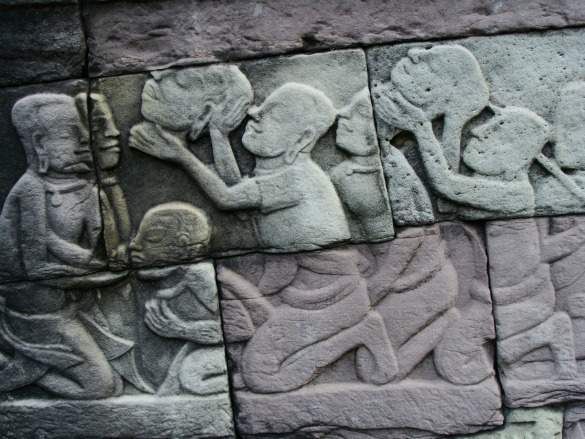These carvings provide a snapshot back in time just like the paintings of the Flemish or Italians give us a glimpse into Western culture. The reliefs depict religious deities but also martial scenes and dipictions of everyday life, frozen in stone for over 800 years. Scenes of going to market, working, and fishing line the same walls as Buddhas of compassion and military campaigns.