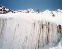 After three day’s trekking through pristine pine and rhododendron forests we climbed past the tree line and into the high country. We established Advanced Base Camp on the lateral moraine of a glacier at about 13,000 feet above sea level. Here the instructors conducted classes on technical ice climbing, glacier crossing, crevasse rescue and building snow caves. Unfortunately, the early morning exercising didn’t stop here. Doing bare-handed push ups in the snow at 13,000 feet is quite an experience.