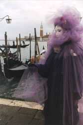 Finally it was the last day of Carnevale and there I was, back at the P. S. Marco. I felt like I knew some of the characters from having photographed them during the last few days. There was an amazing assortment of finery, laces, velvets, metallics, feathers, glitter, spangles and furs. The masks and headdresses were fantastic. The sun made a short but very weak appearance late in the day, then slid behind the Chiesa Della Saluté and was gone. The cold settled around us like a shroud, and still the costumed characters paraded, preened, paused and posed for photographers. Music from the cafés mixed with the laughter of the children, as they ran happily through the crowds tossing bright colored confetti. The temperature dropped as the evening mist and fog began to form, turning the Piazza into a magical, mystical fantasy.