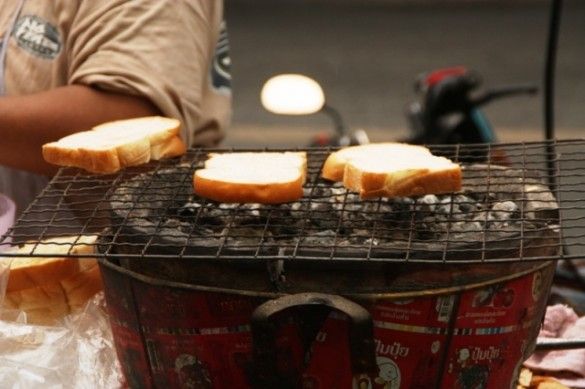 Sometimes I’ll come across a stall that reminds me of a lemonade stand – ie. food that looks like it was whipped up in someone’s kitchen. There’s a stall I pass every day that sells sandwiches that look like they’re ready to go into a kid’s lunchbox. Some days, there’s a chocolate cake messily frosted and cut into uneven squares. But my favorite would have to be the lady who grills buttered bread over charcoal with a liberal sprinkling of sugar.