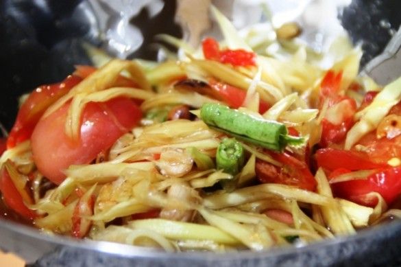 Every stall will have a huge bowl of chopped chilies just waiting to set your tongue on fire. One of my favorite foods is Som Tam, an earthy, crunchy green papaya salad with tomatoes and green beans that absorb all the flavors of limes, tamarind juice, dried shrimp, palm sugar, garlic and peanuts, all crushed up in a huge mortar. When I say “mai phed”, the residual chili leftover in the mortar is usually enough to give it heat without being scorching.