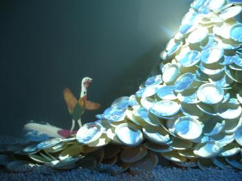 A sculpture of white dishes comes alive with food, which disappears off the plates, accompanied by conversation. Hands, clutching a sponge, appear on the dishes and squeakily clean them. A digital waterfall cascades down and squealing fish leap up from it.. Yvette, the turkey, catches a wave, urged on by an ersatz Beach Boys song, with French-inflected lyrics.