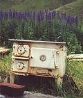 On the way back, we pulled into shore to come to an old abandoned village that had only about four or five wind blown buildings still standing. While the tourists peered through windows and ate a packed lunch, I examined old stoves and carts parked among the fallen foundations.