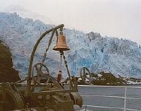 “Next morning at 6 am the ship’s intercom awoke us to suggest coming up on deck to view the d’Agostini Glacier before getting under away! Unbeknown to us the ship had, during the night, cruised through a maze of channels to finally drop anchor at the head of a narrow fiord cluttered with icebergs.