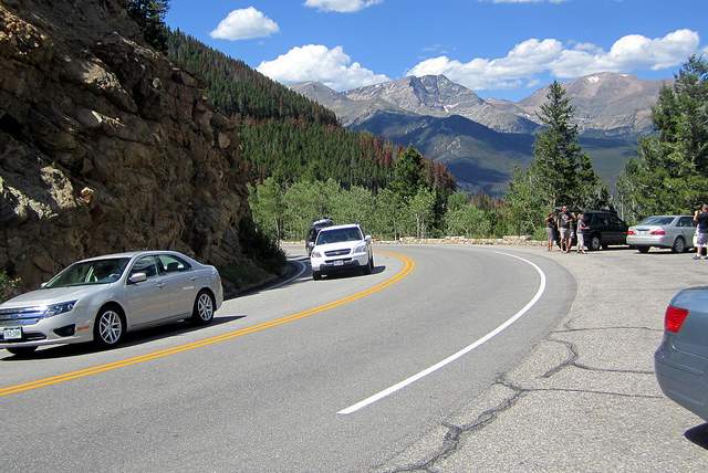 The biggest downside of this beautiful park is that there is one road that runs through it, and that road is a highway. State highway 34 runs across the park from Grand Lake to Fall River, going up into the mountains in the middle. To add to the pain, on 34 just outside the park is Estes Park, a popular resort and ski destination. This means that vast areas of the park are completely unreachable by paved roads, while traversing the park means crawling painfully behind cumbersome RVs that can’t negotiate the steep switchbacks going up or down.