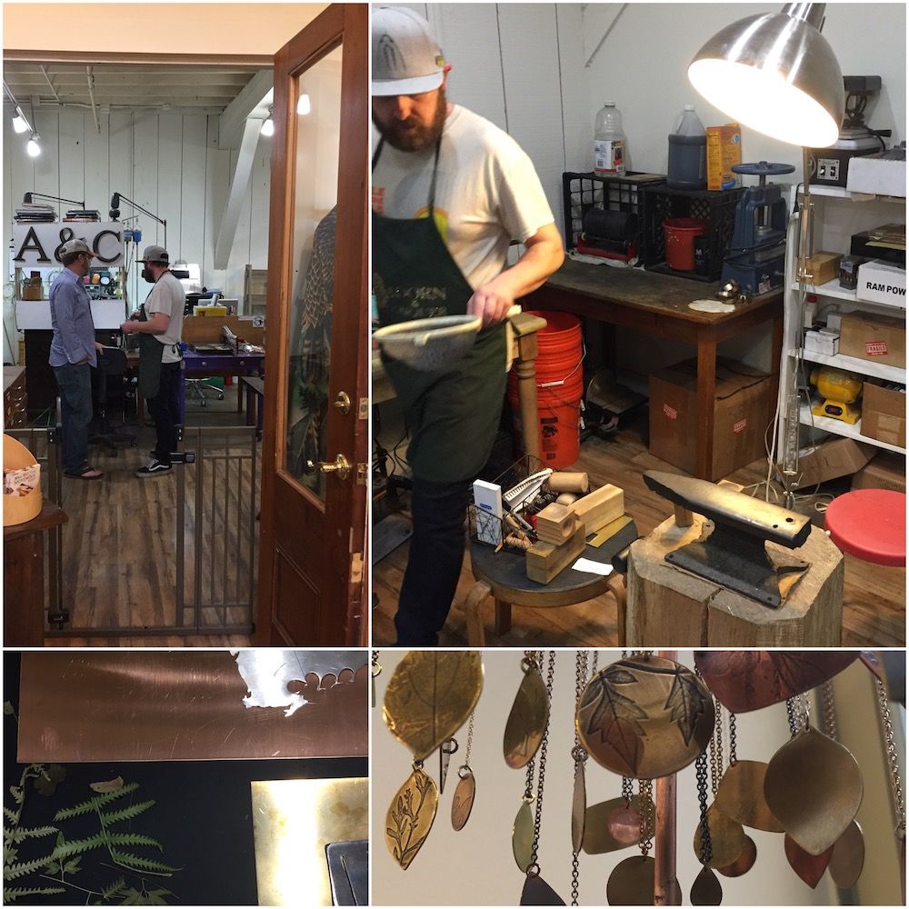 Patrick Shonk gave a tour of their on-site work studio since 2015, which rather than being a look behind the curtain that spoils the magic, made me appreciate the true craftsman nature of “handcrafted.” Live green leaves and different shades of copper resting next to a heavy press revealed the delicate necklaces I saw on display had actually been made with a literal piece of New Orleans foliage.