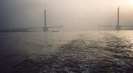 Suspension bridge near Nanjing The next morning dawned sunny and clear and I arose by 6:30am. With two cameras in hand (SLR and handy-cam video), I did not want to miss a moment of this great journey. I arrived on deck just as a huge, half-completed suspension bridge was looming ahead. We had just passed