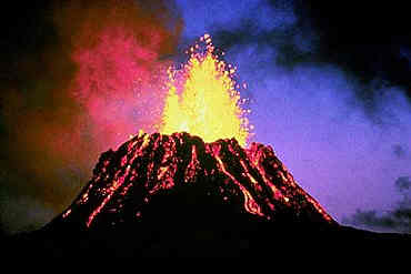 with the glow of lava bombs shooting through the air as the molten rock pours
