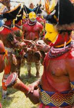 Spears, stone axes, war paint, bright bird of paradise plumes, bare breasted women, grass skirts, Kundu drums, war cries, dog’s teeth necklaces, Kina shell chest plates, headdresses made of human hair, penis gourds, wild bore tusk nose piercings, bows and arrows, warriors in formation, dancers, muscles glistening under the sheen of pig fat, sweat, tropical heat, jungle…Boys Own adventure story? Hollywood fantasy? Dramatic tourist show?