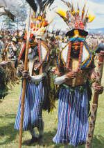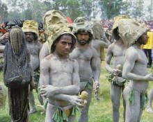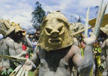 They sport elaborate headdresses made of brilliantly coloured Bird of Paradise plumes and human hair. Round their necks they wear necklaces made of Kina shells that were once used as currency in the mountains. The warriors are armed with spears and traditional stone axes. All the while the masked Mud Men of Azaro silently dance in slow motion to intimidate their enemies.