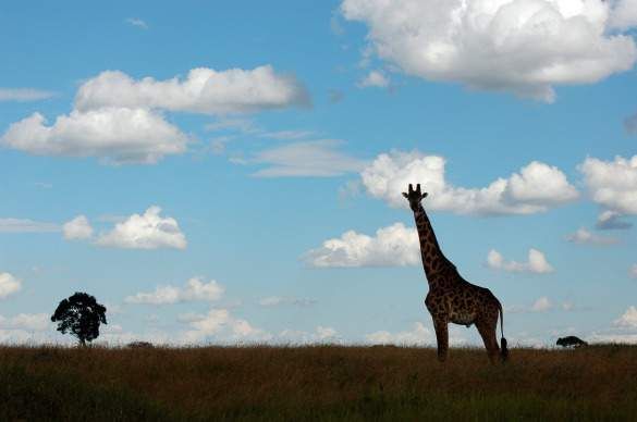 A lone giraffe crossing the Masai Mara