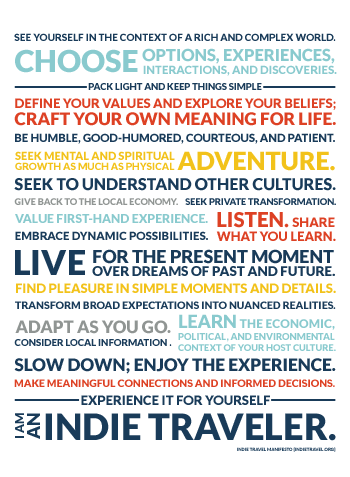 Are you an indie traveler? Join the movement. Sign the Manifesto. Check out the whole Indie Travel Manifesto, add your voice to the conversation, or sign your support.