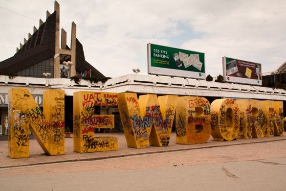 If you decide not to go to the Ottoman part, just walk the other direction of the minarets, towards a park with one of the most ugliest buildings you’ve probably ever seen: the national library. Next to the library is Pristina’s Orthodox cathedral. It is not large, has no windows, has no doors, is full of graffiti, is surrounded by barb wire and if it wasn’t protected by the UN there was probably not much left of it. But for the church and cathedral seekers among you, here you have one. For the rest it’s just a park where you can spend your time sitting and eh… more sitting. Maybe you should buy some beer. It is a great place to watch the sunset though, with some beer.