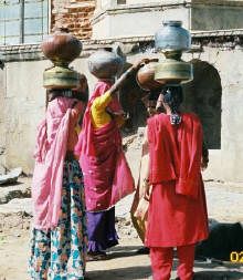 To get to the small village of Parsurampura, we had to cross a dry riverbed, or rather, according to Rajesh, a conglomeration of six sandy beds of ephemeral streams originating from the nearby Aravali hills. Maneuvering the motorcycle through the sandy beds proved to be challenging, and finally we gave up and crossed the wide riverbed on foot. By the time we reached the tiny village, it was close to 8 am. Mothers in their multicolored ghaghra-cholis (skirt-tops) and brilliantly dyed odhnis (veils) were sending reluctant children off to school to conquer the world of words. Turbaned men, on camel or on foot, were on their way to the fields to breathe life into barren lands. Cows and goats moved out of the way while we zigzagged over the narrow cobbled streets, dogs invariably barking at our feet.