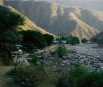Nestled between canyon walls, the narrow town is strung out along the west side of the Río Batopilas (Batopilas River) for about 1,000 meters – a little more than half a mile. Towering shade trees, interspersed with skinny-trunked tassle-topped palm trees, provide coolness for much of the town. The main street, paralleling the river, is partly cobblestone, partly concrete, and sometimes a mixture of rocks and dirt. In the mornings and evenings the air is filled with the gentle calls of myriad whitewing doves hidden in the green-leafed shade trees. Occasionally, at any hour of the day or night, the braying of a lonely (or lovesick) burro ripples through town.