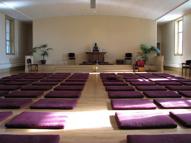 The room is vast and austere, like a giant, empty theatre with meditation pillows spread schematically across the floor.