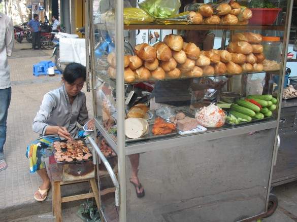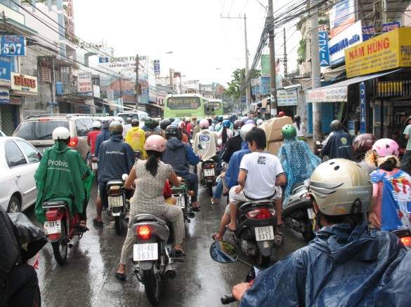 You know how you’re driving and sometimes wish you could just turn around in the middle of the road, reverse until you get to that exit you just missed or haul ass down a one way street going the wrong way? Well, in Saigon, you can. Just go over there from over here, crowd into the same lane as the other five motorbikes and the car and the seven bicycles and the bus, ignore the stop lights and go as fast as traffic will allow. Sidewalk? No problem. One way street? We laugh at you. Painted lines on the street? A waste of money and a waste of paint. Red light? Green light? Both mean Go. It’s hair raising.