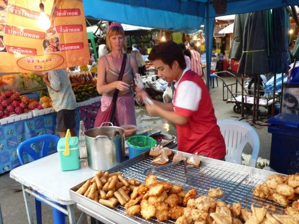 From there, walk east along the river a block or so where you will find a charming waterside restaurant; or climb the stairs, walk across the bridge and down the other side for two equally good canal-side restaurants. Each have fresh, on the spot food and cold beer at extremely reasonable prices. (Cost: 20-60 baht – $1-2)