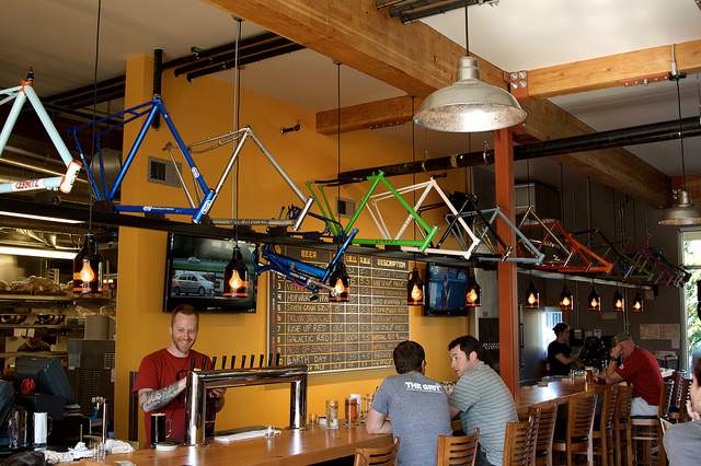 Where to start? Check out this Portland-by-bike beer itinerary by Draft Magazine. Or grab a Portland bike map and figure out the districts and bridges – the Willamette River bisects the city into the east and the west sides, each with its distinct neighborhoods, and a total of ten bridges span the river, eight of which provide some level of pedestrian and bike access. For a tour of Portland’s bridges and some of the best breweries that straddle them, start at The Lucky Labrador northeast in the Overlook neighborhood. From North Portland you can head south, cross the Steel Bridge into downtown, and then ride along the west side of the river, through Waterfront Park. Cross the SE Morrison Bridge, and you’ll find the Hair of the Dog brewery, where you can sample an unusual variety of fine bottle conditioned beers.