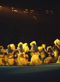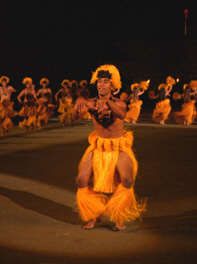 Performers dance in traditional Polynesian dancing styles to coconut-palm drums.
