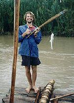 From the beginning I realized that navigating the raft was not going to be easy. The raft was wide, with blunt ends and almost impossible to steer. Pali had never paddled with an oar before and the first half-hour was a learning experience. We finally rowed away from the town and caught the strong current of the river. The raft floated along well and I was even able to use my line and hook that I bought at the store. Within a few minutes I caught an ugly catfish with long whiskers. I had hopes of eating it for lunch but it slipped away while it was being cleaned. I had to settle for rice.