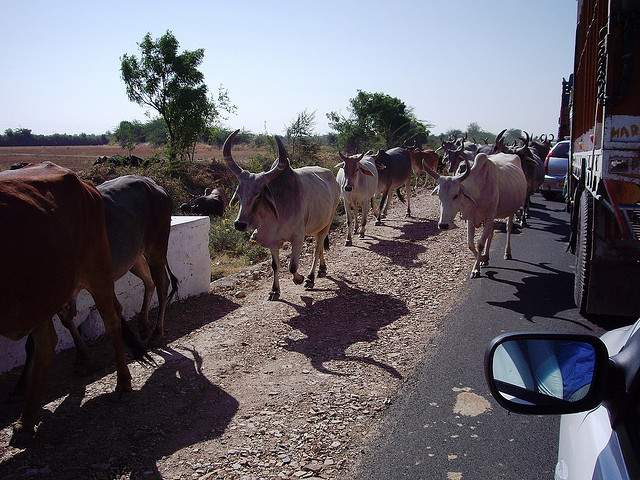 Riding the rural roads of India ranks right up there with the Taj as one of the most unforgettable of Indian experiences. The roads are jammed with cows, goats, camels, water buffalo, and even the occasional elephant. Not to mention people on foot, riding bicycles or motorbikes, or traveling in tuk-tuks (3-wheeled auto rickshaws). Tuk-tuks are supposed to have a legal limit of four passengers, but they routinely carry a dozen or more, including the young macho types who ride outside, standing on the bumpers and hanging on by their fingertips.