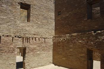 Walking through its endless doorways, Peublo Bonito feels less and less like a great house and more and more like a grand village. Its multistoried construction and intricate architecture amazes me. Chacoan architecture features a unique core-and-veneer construction, with rough stones and debris forming the core to the brown sandstone outer veneer. The trail ahead of us snakes and spirals through small rooms and big kivas. Peering through its characteristic T-shaped doorways and windows, I try to get a glimpse into the lives that once existed within these empty walls. I wonder what ceremonies were once conducted in these great big rooms. Rare treasures such as turquoise and macaw feathers were discovered within the ruins. Were these part of a sacred ritual? Or were they just trade items that exchanged hands of a diverse group of people? What attracted them to this region? What drew them here? All sorts of questions swarm through my head as I wander through the ruins.
