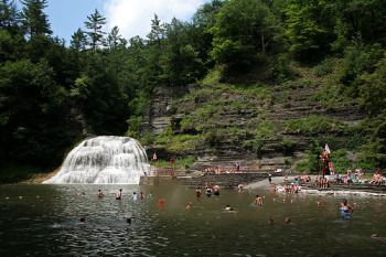 Named by SwimmingHoles.org as one of the best swimming holes in the U.S., Robert H. Treman State Park boasts a natural swimming hole with a diving board letting swimmers plunge into a deep pool at the foot of a huge waterfall.