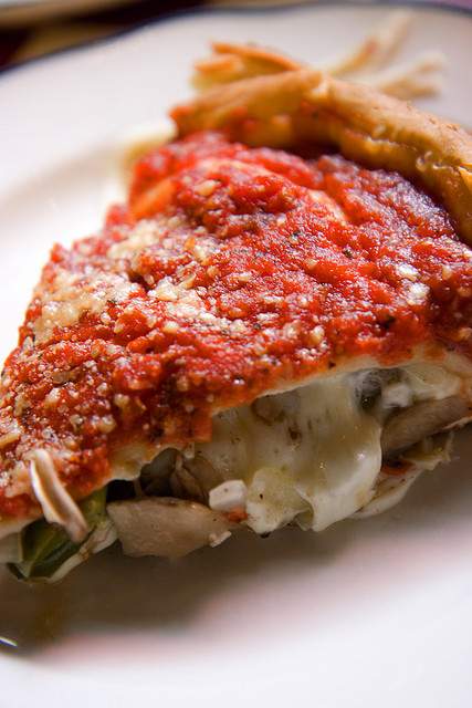 A knife and fork are usually in need if you’re diving into a deep-dish or stuffed style pizza from Chicago. The Windy City serves up this massive meal that can easily measure four inches high, reversed with cheese on the inside and sauce on the outside. It can be filled with any typical American ingredients you’d like, but the most popular choices amongst both locals and visitors is chunks of juicy Italian sausage, green peppers and mushrooms. If you’re looking to give it a whirl, you’ll need to have some time put aside since when the pizza is made fresh, it can bake up to 45 minutes depending on the size.