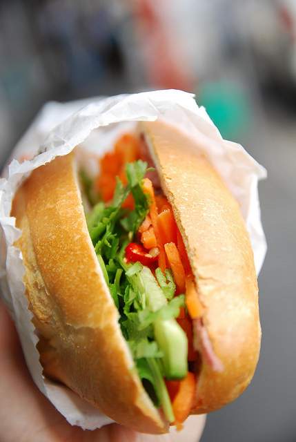 This Vietnamese sandwich consists of a baguette made with both rice and wheat flour, meats like sausage and pork (or veggies and tofu), and toppings of carrots, cucumber, cilantro and chili peppers.