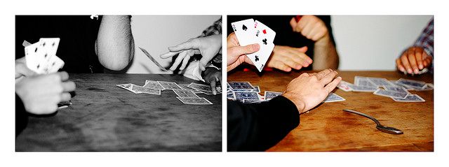 When someone has four of a kind, they reach for a spoon, which is the prompt for the rest of the players to grab a spoon as quickly as they can. The person left without a spoon incurs a drinking penalty.