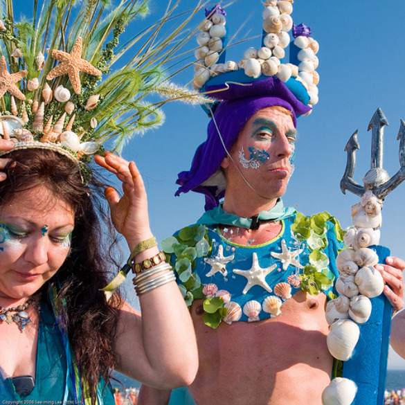 The annual Mermaid Parade, held along Surf Avenue in Coney Island, is the USA’s biggest art parade. Celebrating the beginning of summer, participants dress in costumes representing the spirit of the ocean and paying homage to the freak show, burlesque, and generally campy nature of summer boardwalk culture. Following the parade, King Neptune and Queen Mermaid stroll down the beach, cutting ribbons and tossing fruit into the water to “appease the Sea Gods”, and the summer season officially begins.