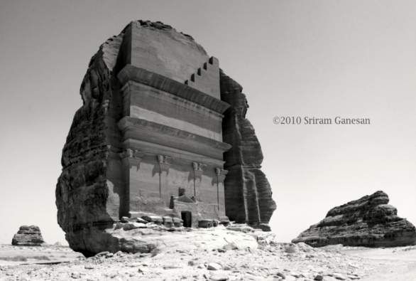 The next morning, having forgotten to make the necessary permit arrangements (a week) in advance, as required by the current bureaucracy, I began the palm-greasing ritual. An employee at the hotel, I’ve forgotten his name, faxed Riyadh with my details and within an hour I had some paperwork that, inshallah, would get me through the gate. He made no promises. I thanked him, cast my traveler’s-snobbishness aside, and set out looking for a camera. As I drove down the road a man in traditional Saudi garb, thobe and red checkered head scarf, pulls up alongside me in a white SUV and gestures for me to pull over. Thoughts of a duct tape gag, rope burns, and a gurgling demise, ran through my mind. I was reluctant. But, he looked vaguely familiar. I pulled over, got out, and we met half way. He informed me that Madain Saleh was in the other direction. I thanked him and said I needed to find a camera first. It was true, but, more importantly, provided a convenient excuse to distance myself from this intruder. He then said, “I police man”. We shook hands and departed.