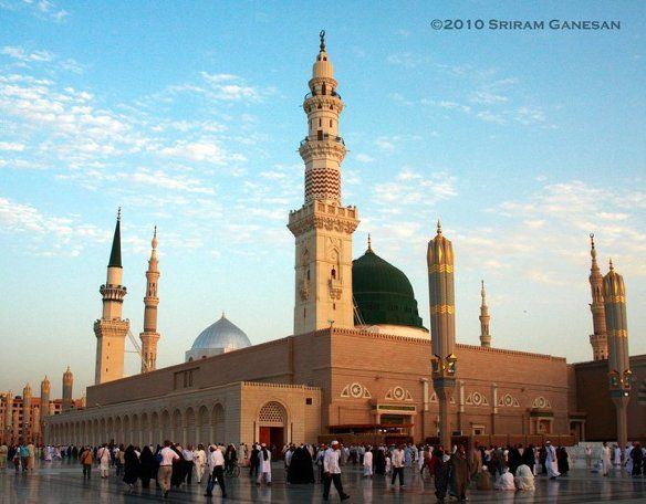 If there was a checkpoint, I didn’t see it. I entered the holy city and immediately a palpable tranquility and easiness, unlike any other city I’ve ever been in, took hold of me. The location, unsurprisingly, was gorgeous. And the Prophet’s Mosque, well, easily the most impressive one that I’ve set foot in. I found it as the azan was calling the faithful for asr, or the afternoon prayer. And, as if it was written, I found a parking place less than two blocks from the main courtyard and joined the others in walking, humbly, to the sound of silence, in the middle of a city of millions. Every act, in Islam, is one of worship or profanity. It’s believed that every step, towards the mosque, for the believer with the right intention, yields benefit from above; like a prayer in itself. Men embraced hands, allowing their sins to drip, like water, off their hands—as recorded in the sunna. There were people from all over the world representing their homelands in dress. And then there was the huge marble courtyard with the massive, elaborate, retractable umbrellas to shade it. Beautiful minarets piercing the sky. An interior modeled on the mosque in Grenada. Majestic gold and blue patterns on retractable vaulted domes. Silent air-conditioning, by virtue of having the cold air pumped through the desert from a site(s) several kilometers away. And tens of thousands of gentle worshipers.
