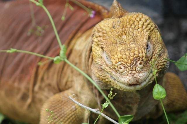 There were many such moments in the Galápagos – opportunities to interact with the native wildlife that didn’t cost a nickel. At the Charles Darwin Research Station, we meandered along the walkways of the turtle corrals, checking out tortugas in the full range of sizes – from little miniatures to the Goliaths of the reptile kingdom. They languished in the shade of Opuntia cactus trees, while in another enclosure, gilded land iguanas feasted on stalks of edible greenery.