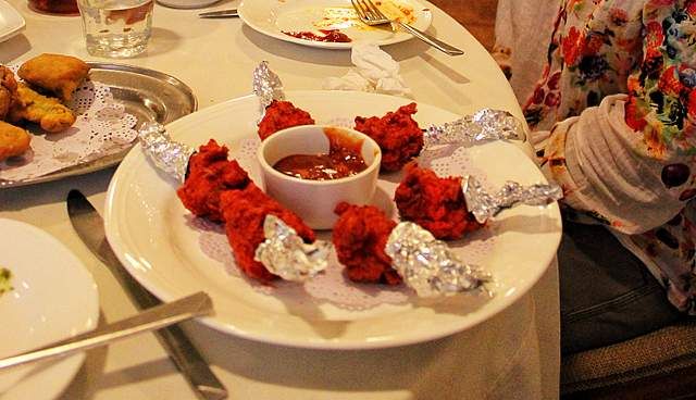 Chinese food available in India is almost unrecognizable to anyone who’s familiar with authentic chinese food. Mumbai has spiced it up and created all sorts of innovative fusion dishes right on the streets. You’re sure to pass by the brightly painted carts, woks ablaze, Chinese looking men who aren’t actually from China, whipping up never heard of dishes like Triple Schezwan, Chinese Bhel (crispy fried noodles in a spicy schezuan paste), and Chicken Lollipops (Scarlet coloured batter fried chicken legs), to name a few. Manchurian (Salty and Brown) and Szechuan (Spicy and Red) are the two primary flavors, and everything (from Chicken to Rice to Noodles) comes in those two flavors. I must warn you, it’s a heart attack on a plate, but innovative and lip-smacking nonetheless.