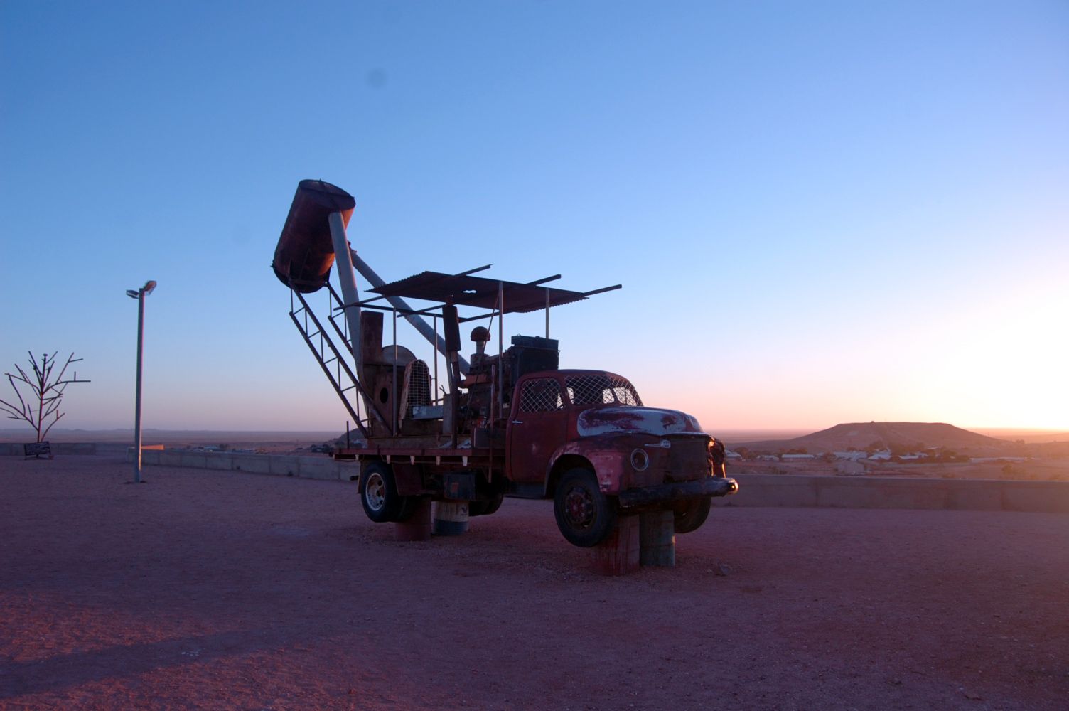 The Winch at sunrise possesses a transcendent, otherworldly beauty. I surveyed the apocalyptic landscape, illuminated by heavenly hues whose splendor was emphasized by the solitude. In Coober Pedy, the addition of iconic mining machinery sporadically strewn across the scene adds to the bizarre Outback experience.