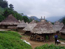 The climb takes approximately eight hours each day on a 70% gradient of mud filled switchbacks, heavily eroded by rain, donkeys and occasional trekkers. By about 6:00 p.m., I start thinking that we are close to our accommodation – it's late, there are several small houses at the bottom of the trail ahead, before the river. I walk in the midst of the houses; no trekkers, two small boys sharpening machetes on a wet stone. I look for more signs of life – a topless man, a moustache wreathed in tobacco smoke, silently watching the muddy, damp human traffic slowly passing by.