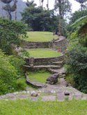 The first structures consist of a few circular walls about two meters high, heavily encrusted with a long, light green moss. As I walk around the first of these structures, I feel slightly underwhelmed. How does this constitute a city? Hearing the calls of one of our party who sounds lost. I silently round the building and make a concerted effort to scare the shit out of him. “Very funny!” he exclaims as he picks himself out of the mud. “Where is everybody?” “Don’t know, but I assume they have gone up there”, I say as I point to the wide elaborate stone stairway I haven’t noticed before due to the trees.