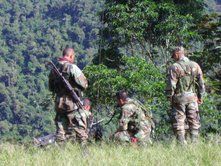Later we drink coffee, interact with the soldiers who are waiting for El Presidente’s arrival the next morning. It turns out these men spend months at a time in the jungle, moving from map reference to map referenc, collecting air drops of supplies and ammunition. They are naturally quite pleased to see us. Soon they are displaying their weapons and hand the nearest female a 5.56 millemeter Galil assault rifle, with a fair bit of posing with gringos and soldiers.